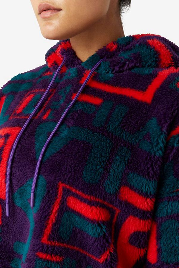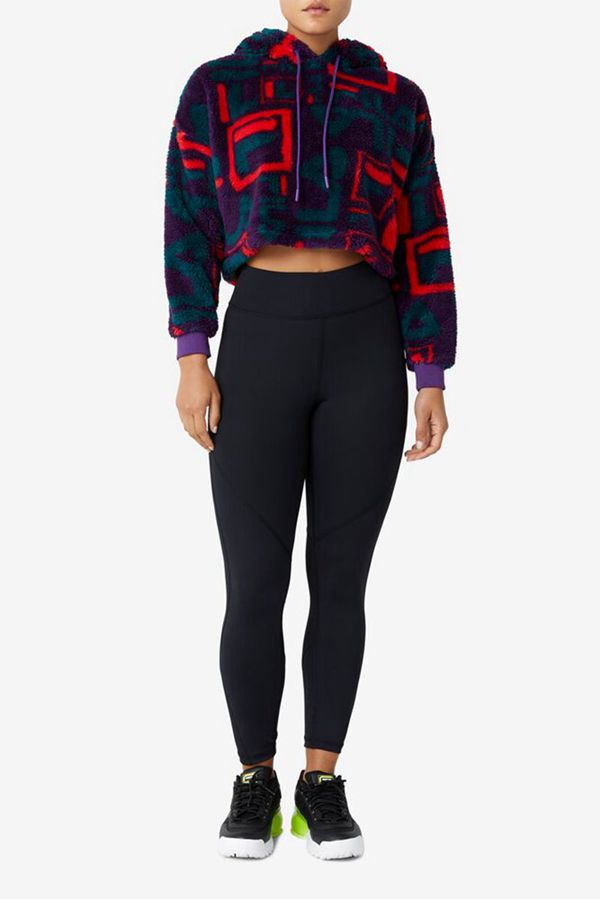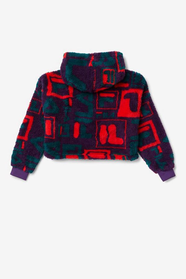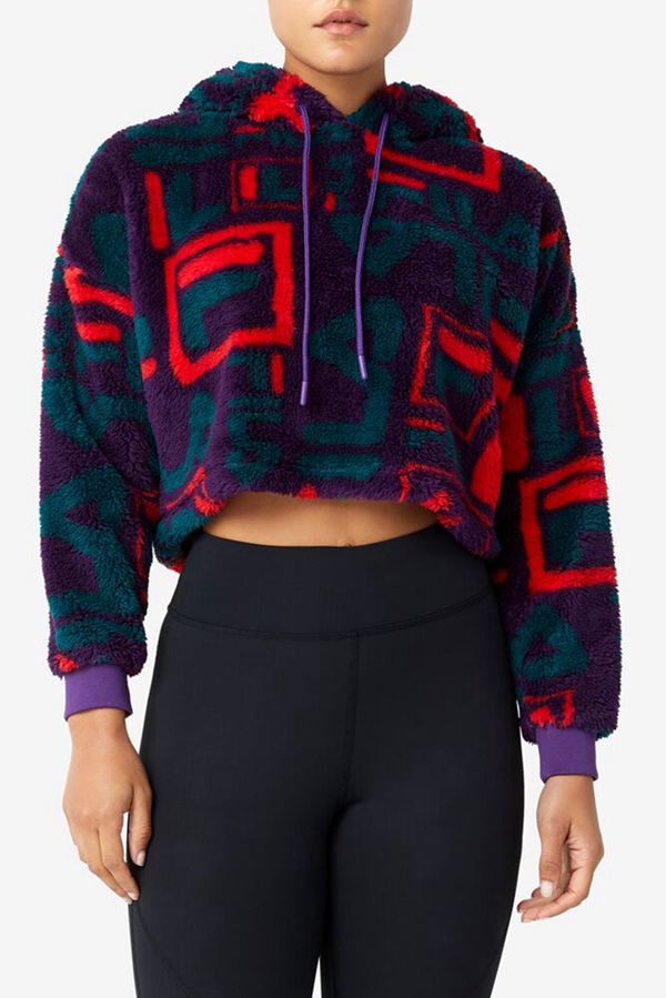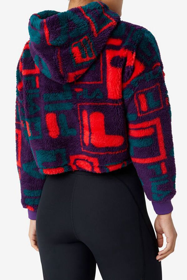 Women's cropped long sleeve fleece jacket. All over logo design. Stay cozy with Fila fleece.