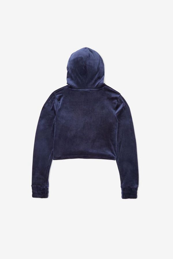 Casual elegance is achieved with this cozy velour hoodie featuring a large logo across the chest and a drawstring at the bottom hem for a customizable fit.