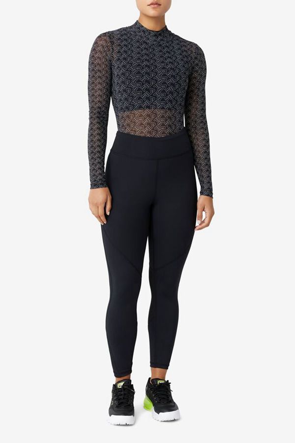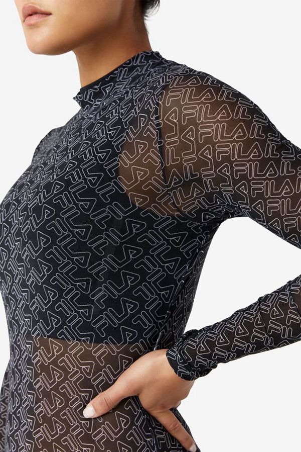 Women's black and white sheer bodysuit. A sleek long sleeve high-neck bodysuit for a stylish night out or a comfy night in. FILA.