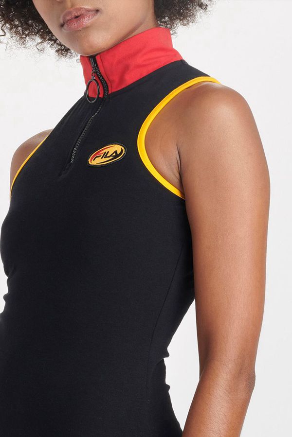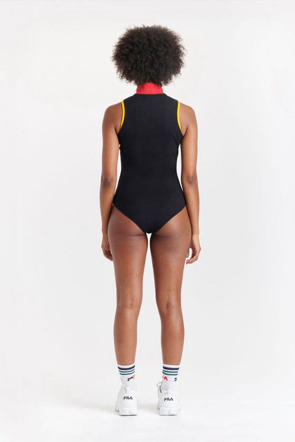 This sporty sleeveless Roldana 1/4 Zip Bodysuit features a quarter-zip closure design with high collar and contrasting piping outline on arms. Finished off FILA oval logo patch on the left crest.