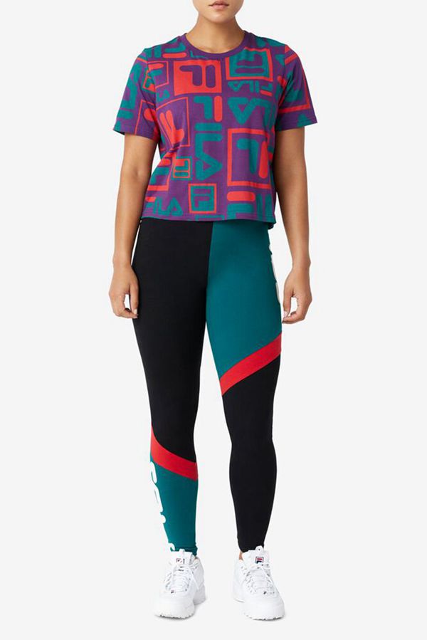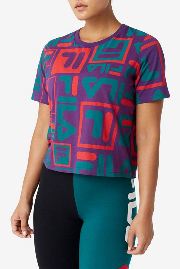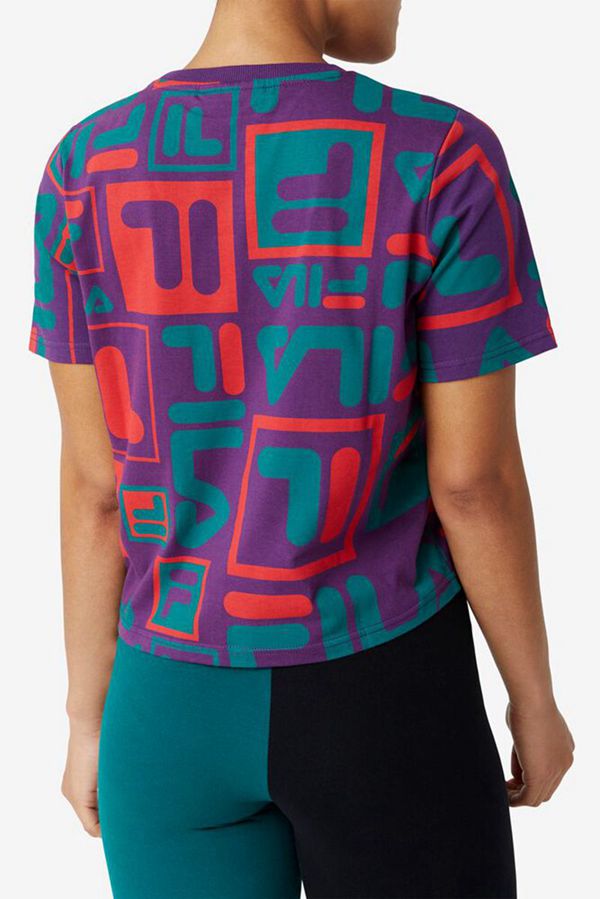 Women's crew neck short sleeve tee featuring a colorful all over logo design. 'Tis the season for Fila loungewear. FILA.