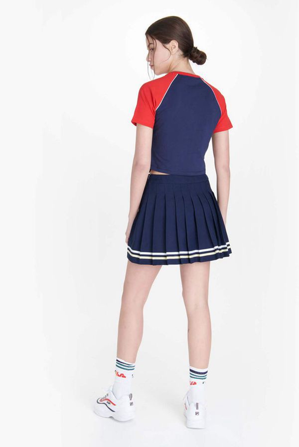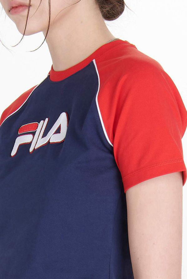 90's throwback to our Salma Colour Block T-Shirt features a two-tone colourway with a bold embroidered FILA logo outline across the chest.