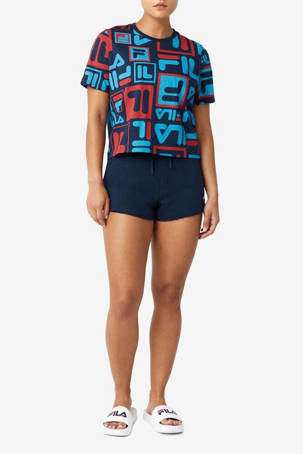 Women's crew neck short sleeve tee featuring a colorful all over logo design. 'Tis the season for Fila loungewear. FILA.
