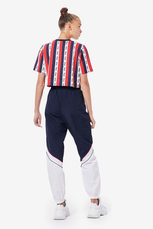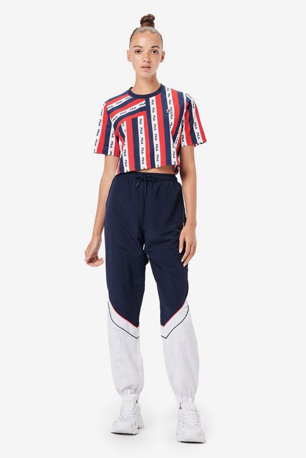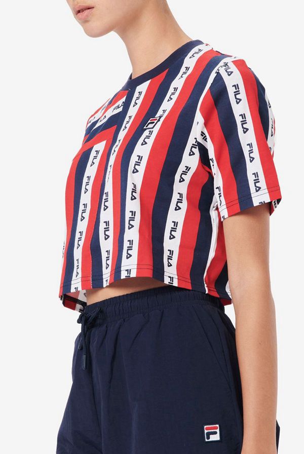 The soft MUDRA T-Shirt features an all-over stripe FILA linear logo print complete with short sleeves, ribbed collar, and crop design.