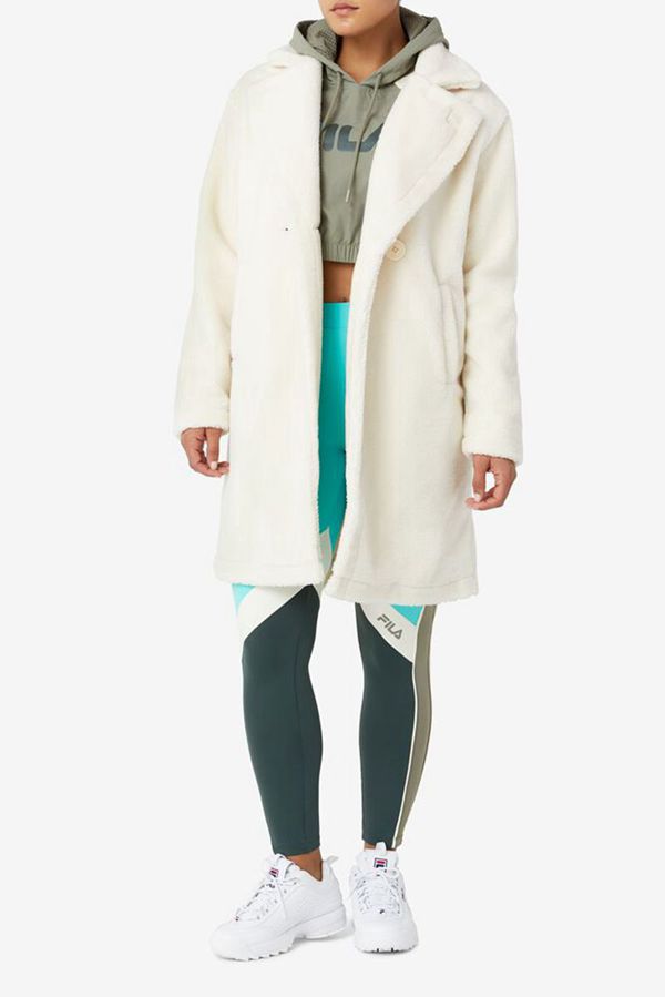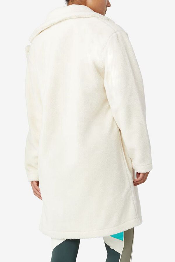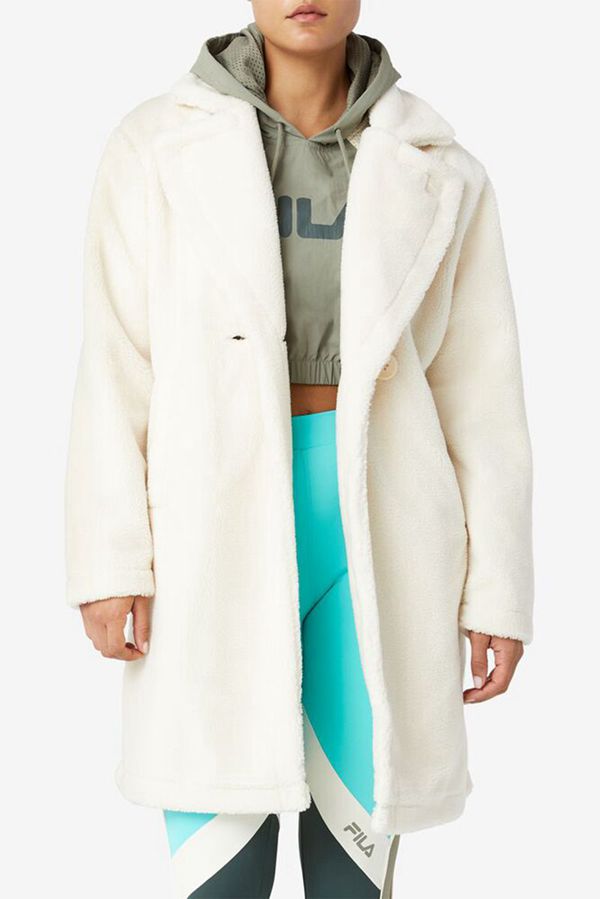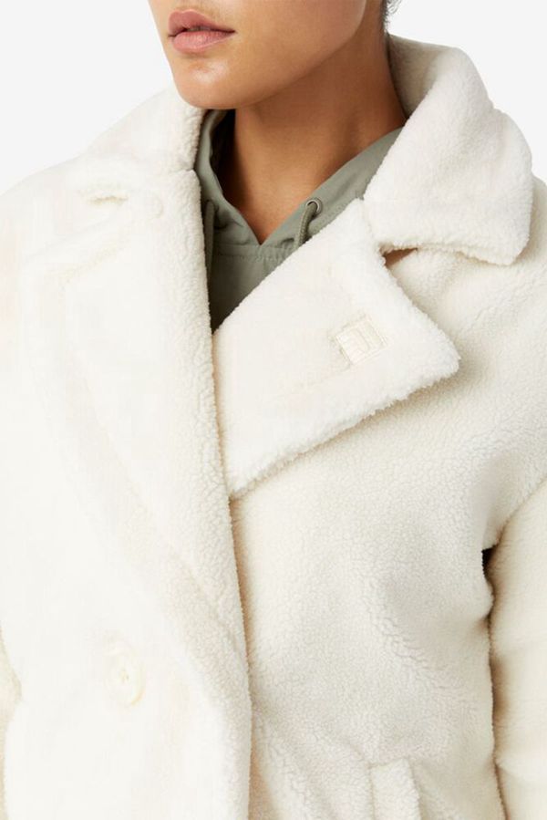 A must-have of the season. Cream faux sherpa. Double breasted. Notched lapel. Pair with casual kicks for ultimate winter street style.