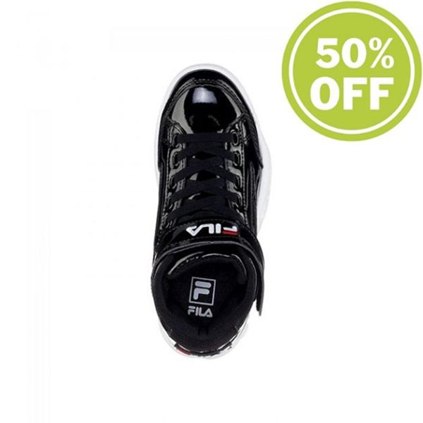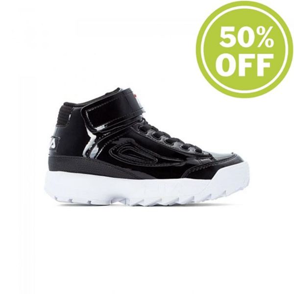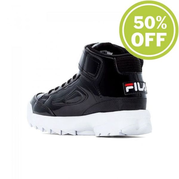 FILA D2 Disruptor Mid metallic black with a big FILA Logo on the closure. The shoe has got a narrow fit. Our recommendation: order one size larger as usual. gender: women