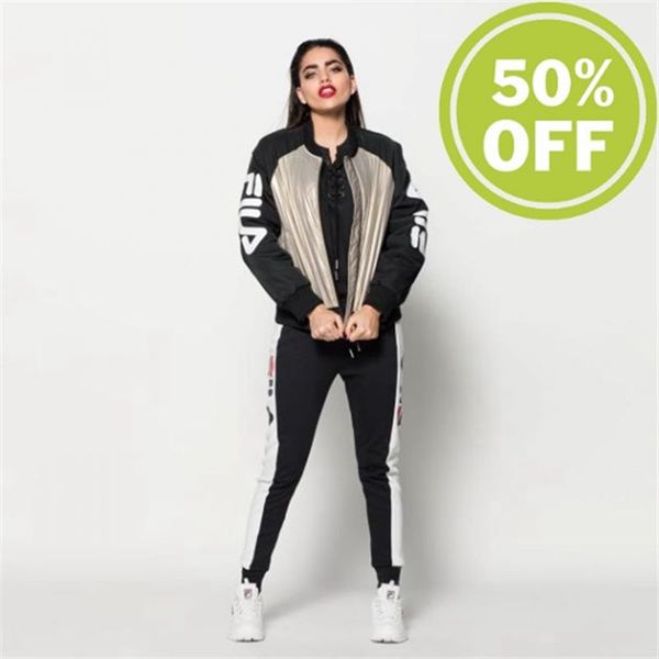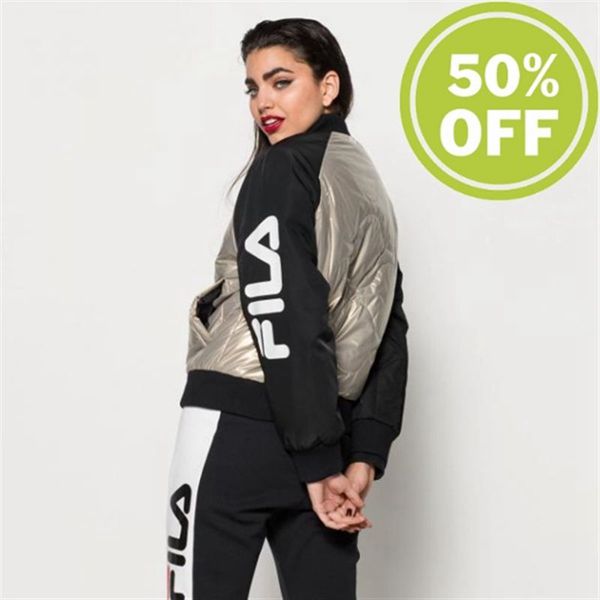 Hot bomber jacket in gold-black with white FILA logo at the sleeves. women
