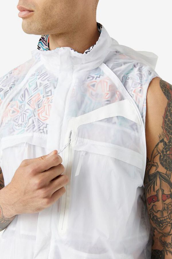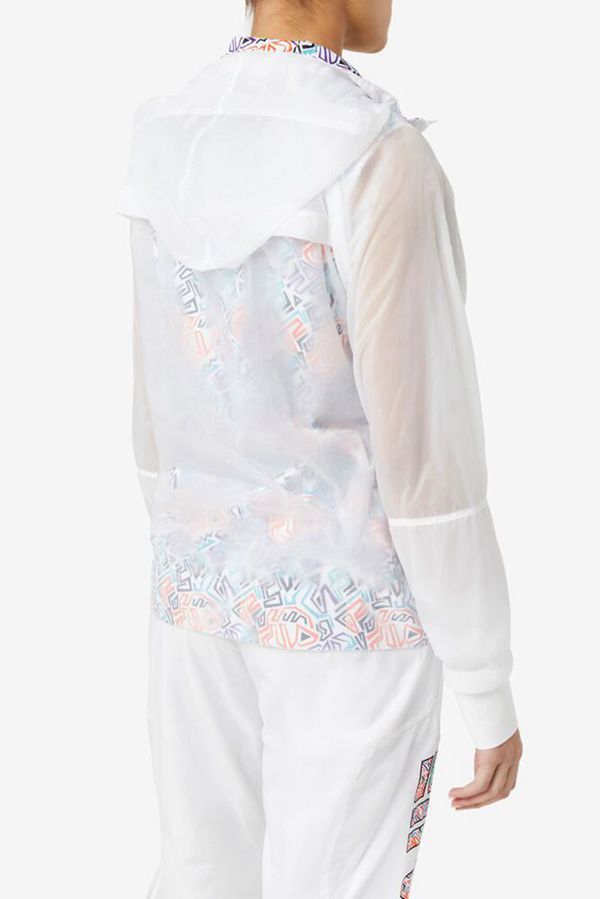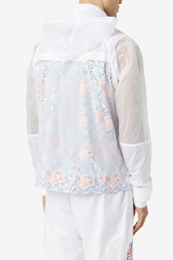 Lightweight jacket with translucent layer over celebratory abstract print.