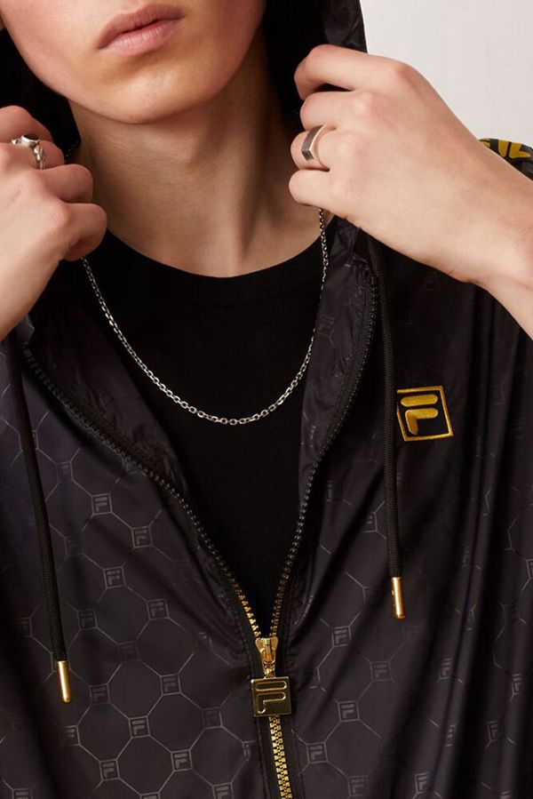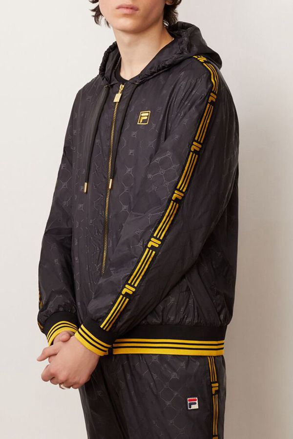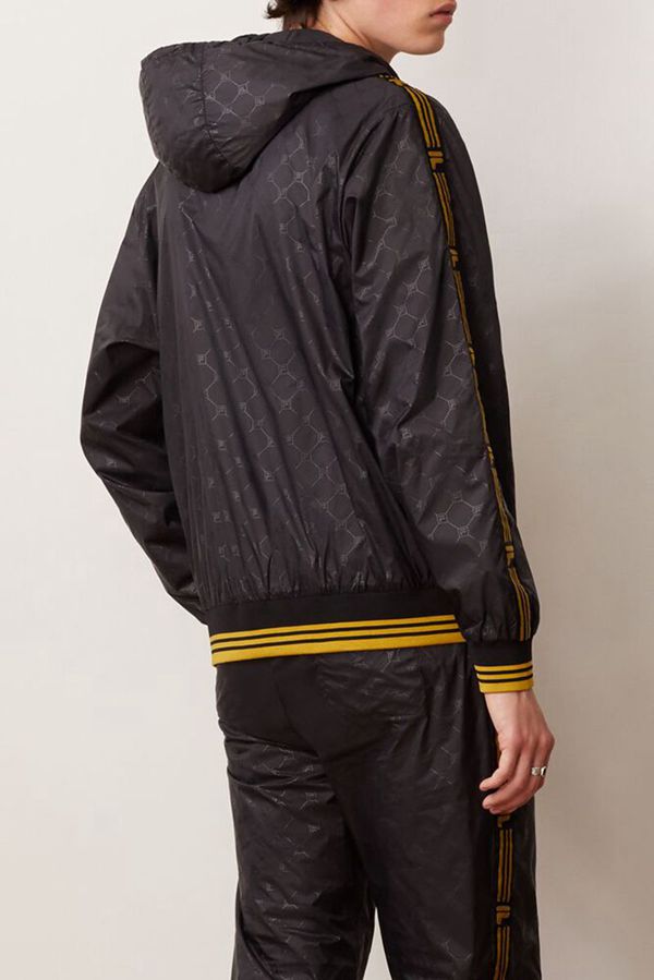 Black and gold shine together on this premium windbreaker jacket featuring a tonal all-over embossed pattern and contrast accents down the sleeves.