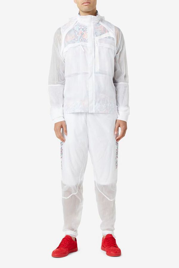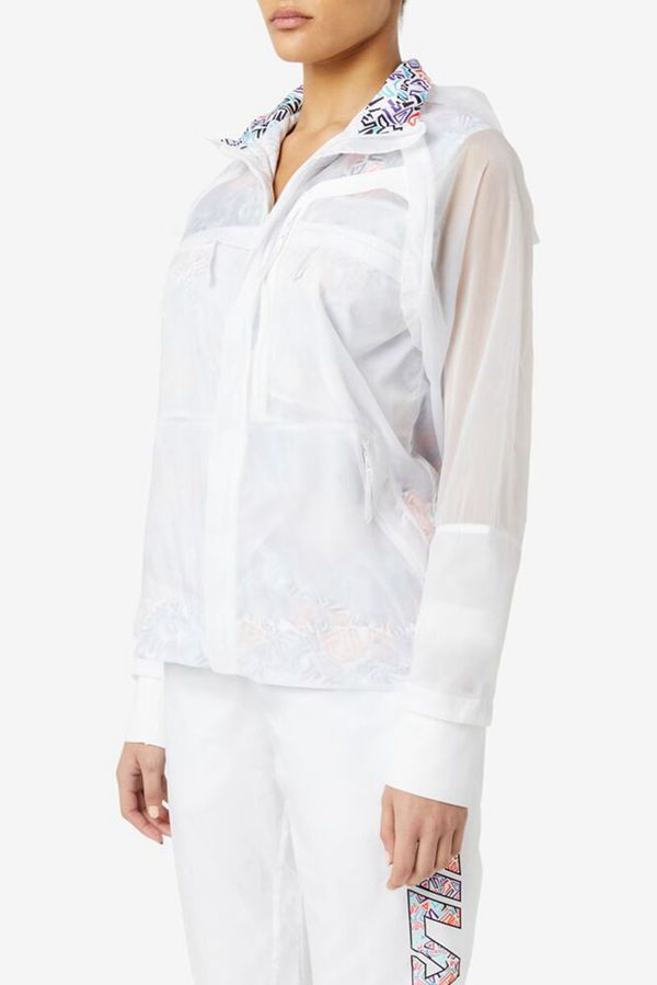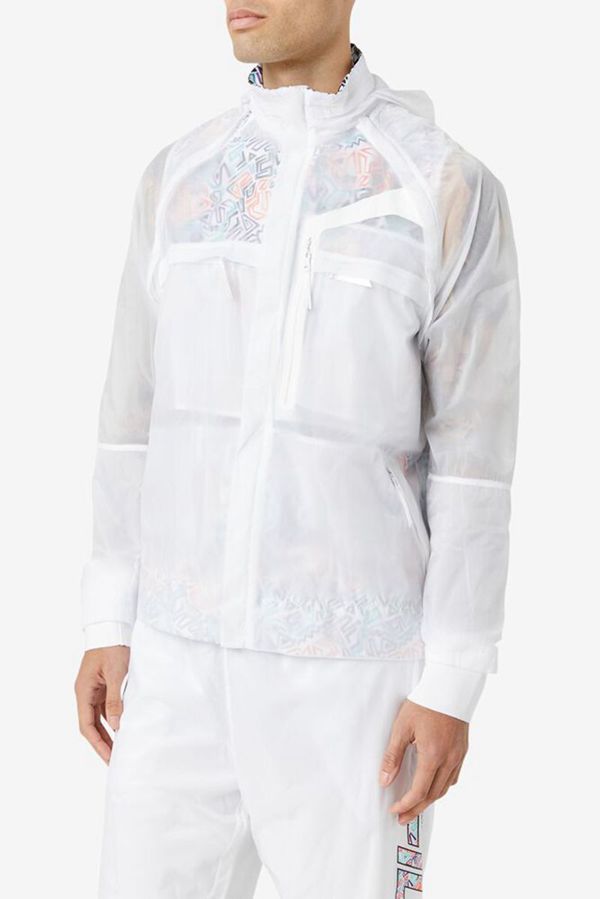 Lightweight jacket with translucent layer over celebratory abstract print.