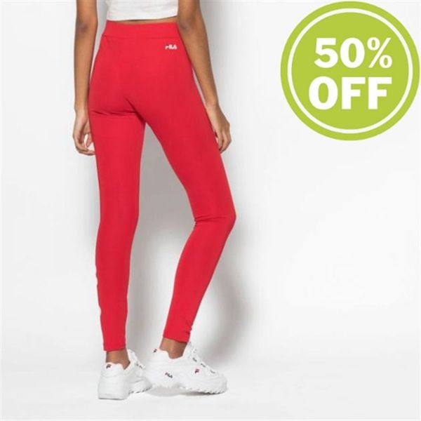 Fashion tight in red and with big FILA logo on left leg. gender: women