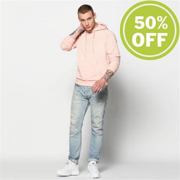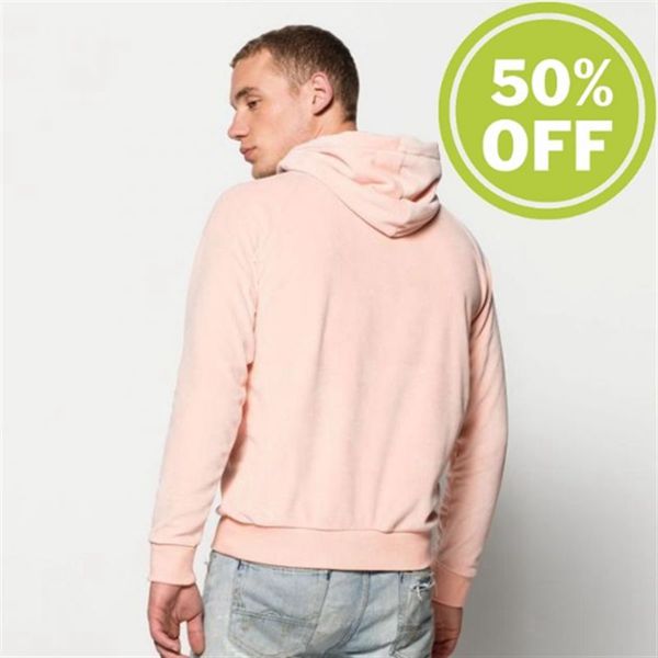 Velour hoodie in pink with tonal logo and kagaroo pocket. men
