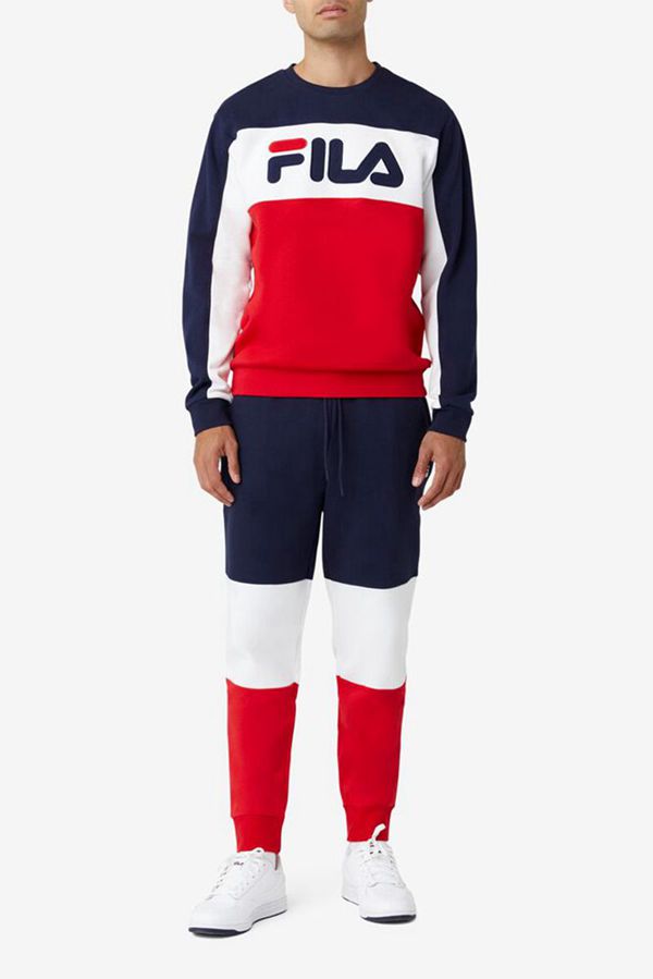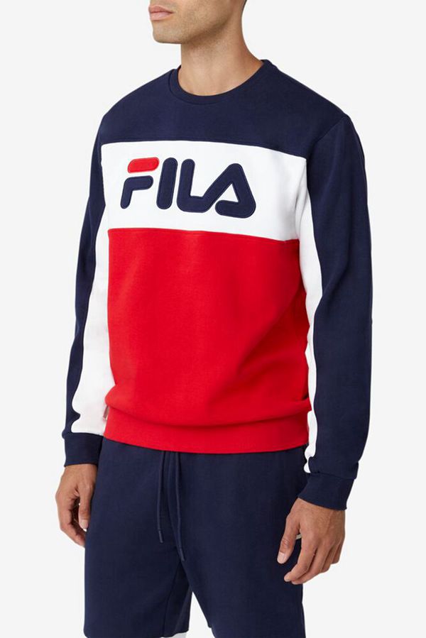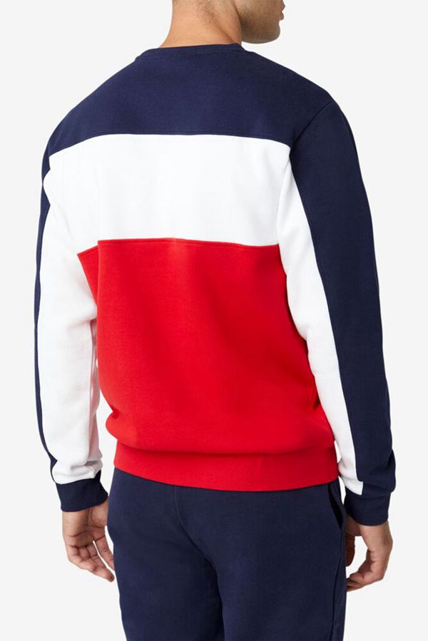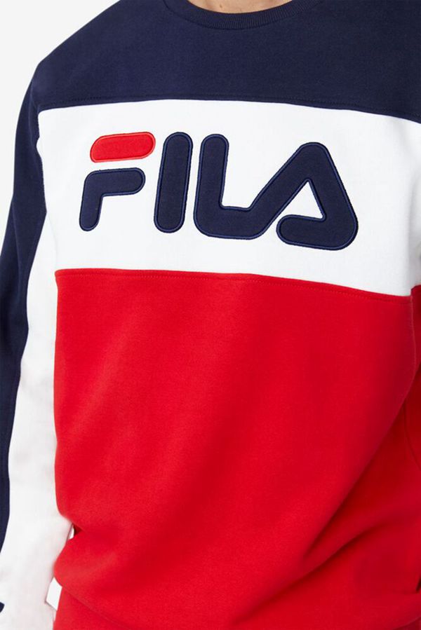 This unique crew neck fleece features a distinct tri-color block with large FILA logo taking center stage on the chest.