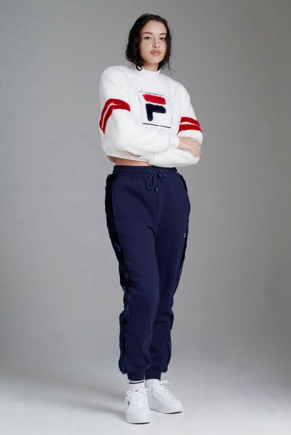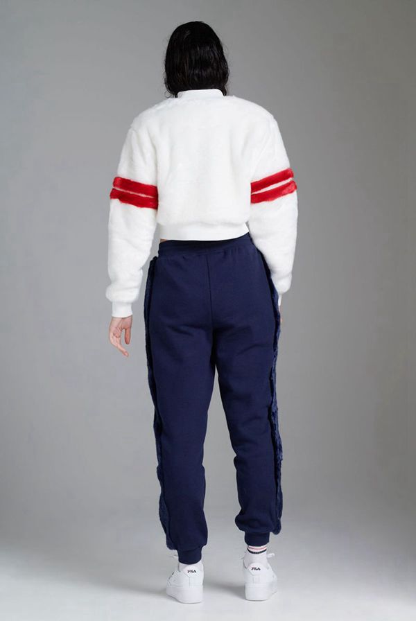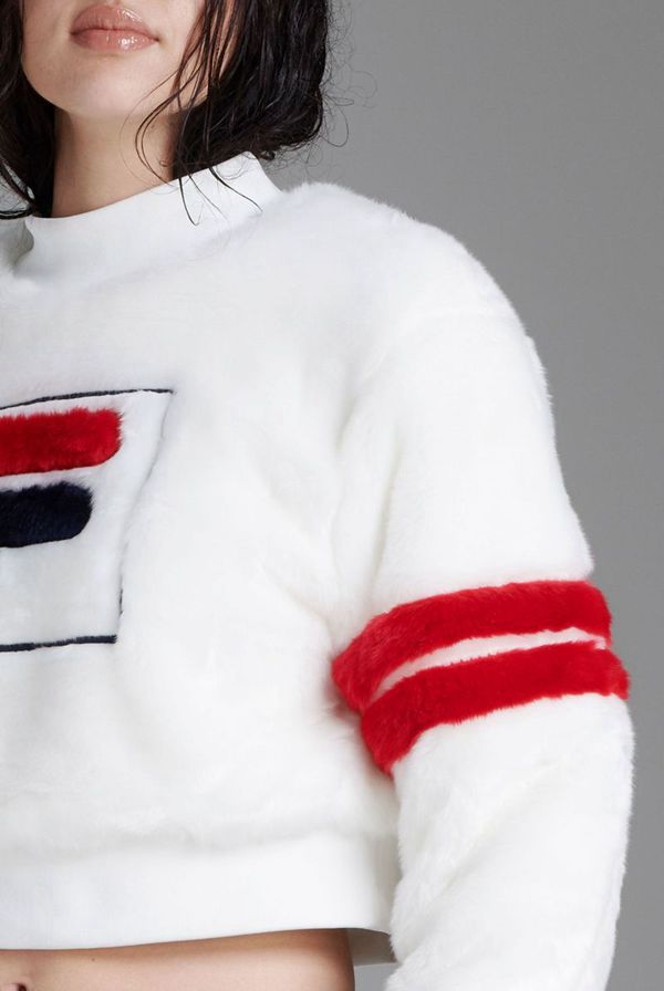 This faux fur sweatshirt stands out with its fuzzy texture, large F-Box logo, and double-stripe detailing on the sleeves.