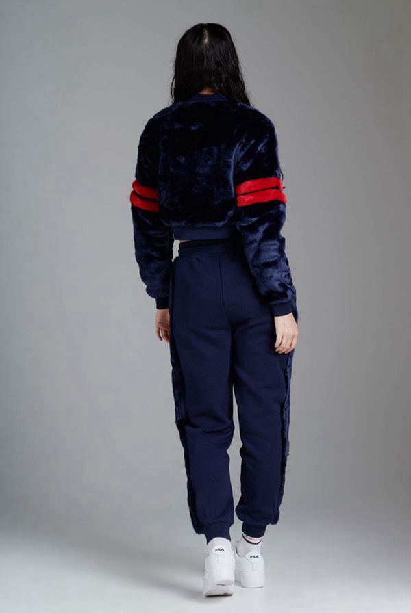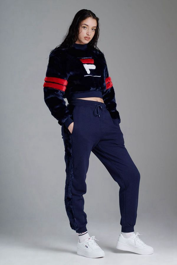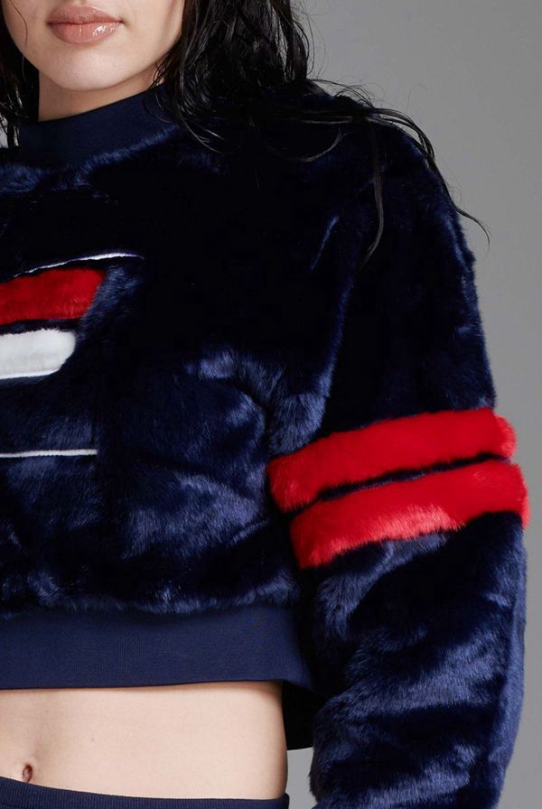 The faux fur sweatshirt stands out with its fuzzy texture, large F-Box logo, and double-stripe detailing on the sleeves.