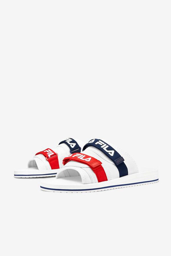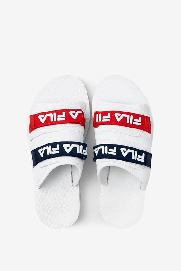 printed FILA linear logos across adjustable velcro straps