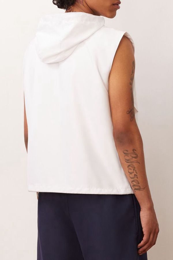Perfect on its own or as a layering piece, this bold vest features a nylon construction with a hood and multiple pockets for a tech-inspired aesthetic.