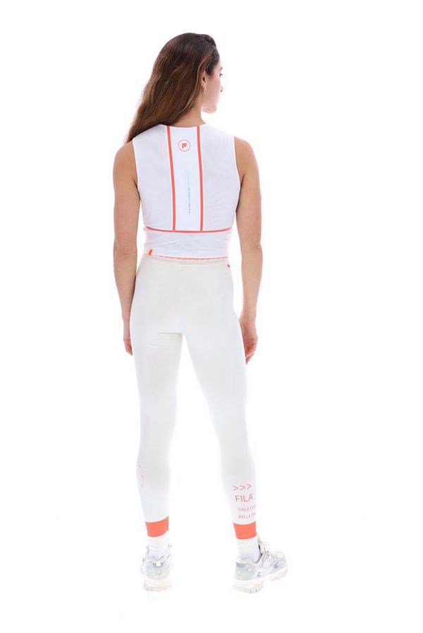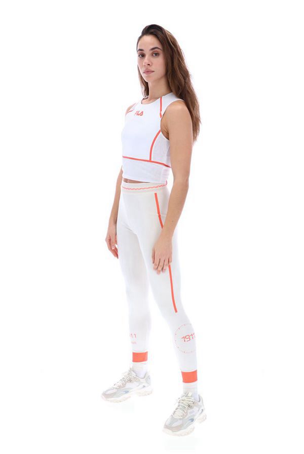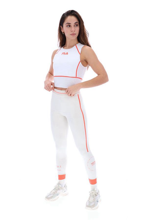 The Dara Sports Top features a racer-style neckline, a cropped design with a symmetrical linear pattern. The top is finished off with a colour contrasting centralised FILA logo